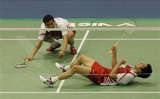 South Korean Lee Yong- dae, bottom, reacts after scoring a point as his teammate Jung Dung-jae looks on during men's doubles final match against Chinese Cai Yun and Fu Haifeng during the Korea Open Badminton Super Series in Seoul, South Korea, Sunday, Jan. 17, 2010. South Korea won the match 21-11, 14-21 and 21-18.