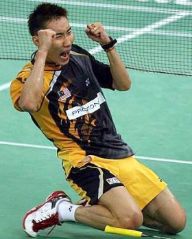 Lee Chong Wei celebrates after beating Thailand's Boonsak Ponsana in the Malaysian Open Badminton Final at Putra stadium in Bukit Jalil Sunday.