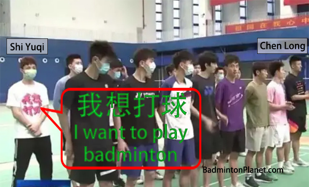 The four Chinese characters written on Shi’s T-Shirt could be a silent way of informing the Chinese Badminton Association about his strong desire to start competing again.