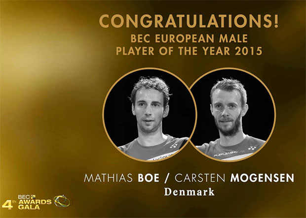 The BEC Best Male Player of the Year 2015 title was awarded to Danish men’s doubles pair Mathias Boe and Carsten Mogensen, who won the Syed Modi International Badminton Championships in March last year by defeating Vladimir Ivanov/Ivan Sozonov of Russia. The Denmark pair also claimed the prestigious All England title and the men’s doubles gold at the 2015 Baku European Games.