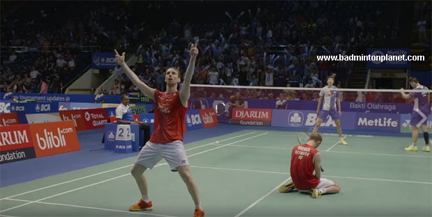 Carsten Mogensen drops to his knees while Mathias Boe celebrates their 1st round victory at the 2016 Indonesia Open.